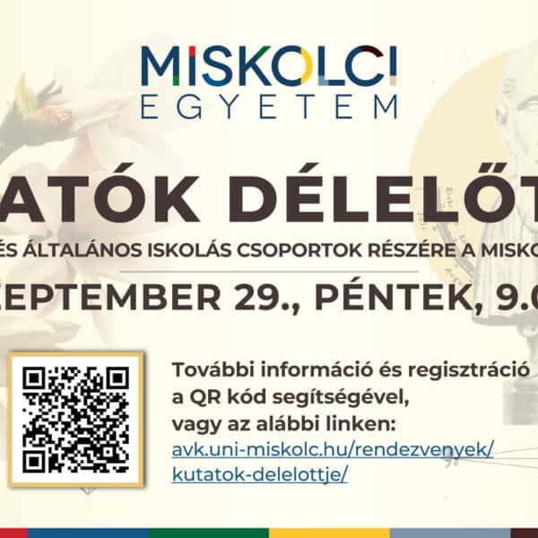 Általános iskolásokat és középiskolásokat várunk egyénileg, családdal vagy csoportosan, akár iskolai szervezésben a Kutatók Délelőttjén a Miskolci Egyetemen. Tudományos előadások, szemléletformáló programok, laborlátogatások és szórakoztató elfoglaltságok várják az érdeklődőket. Bővebb információk, részletes program, a programok ismertetése és regisztráció itt található.