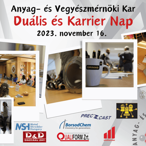 Az Anyag- és Vegyészmérnöki Kar Dékáni Hivatala 2023.11.16.-án 11:00-13:00 óra között Duális és Karrier napot szervezett, amelyen a hallgatók a duális képzésről, szakmai gyakorlati lehetőségről, szakdolgozat/diplomaterv témákról, álláslehetőségekről szerezhettek további információkat. Az eseményen készült képet itt érhetőek el.